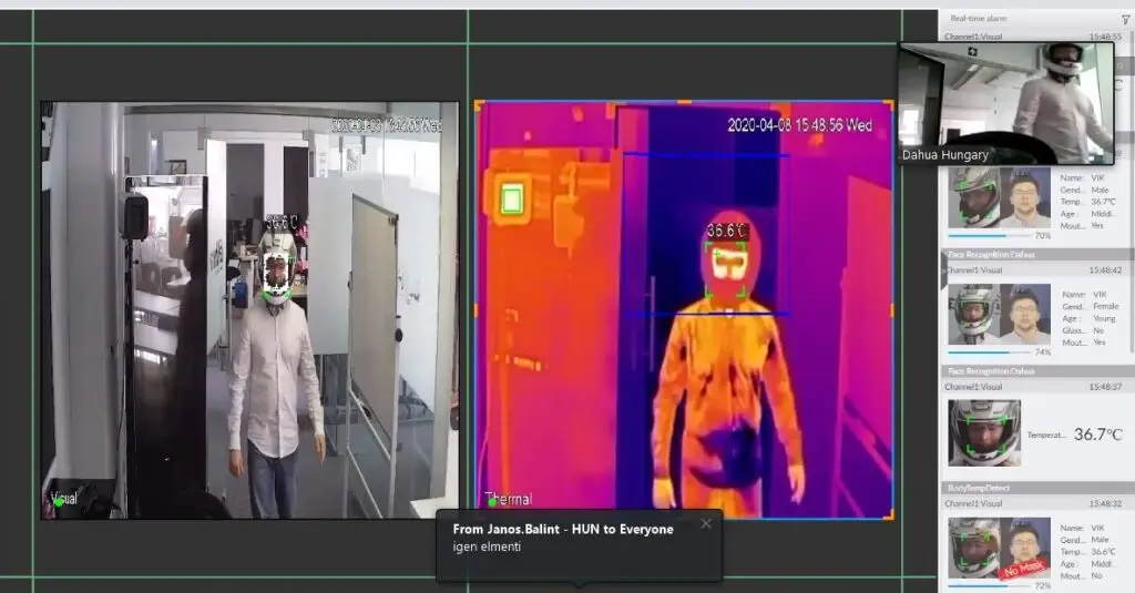 Felvételünkön (mely a budapesti irodánkban készült) egyértelműen látszik, hogy akár maszkban, akár maszk nélkül, folyamatosan haladó sorban képes a rendszerünk az egyének testhőmérsékletének egyedi érintésmentes mérésére!